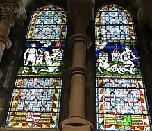 Burges conceived the iconographical scheme for the stained glass windows, designed the individual panels for each of the 74 windows, and oversaw every stage of their production. According to Maurice Carey, "in consequence, the windows have a consistent cohesive style and follow a logical sequence in subject matter".[54] The panels were cartooned by H. W. Lonsdale and manufactured in London between 1868 and 1869 by William Gualbert Saunders, who worked in Burges's office before forming his own firm of stained glass makers.[19][57] Doctrinal objections to some of the figures, particularly of Christ, lead to a four-year delay, with their eventual installation between 1873 and 1881. Four windows remain incomplete.[58] Lonsdale's cartoons are kept at the cathedral.[58]