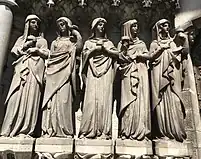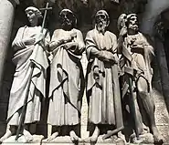 Burges's designs for the western façade were based on medieval French iconography. He considered this front to be the most important exterior feature, as it would be lit by the setting sun and thus the most dramatic.[47] The theme is The Last Judgement, with representations of the twelve Apostles bearing instruments of their martyrdom, the Wise and the Foolish Virgins, the Resurrection of the Dead and the Beasts of The Evangelists.[48] The gilded copper "resurrection angel" facing eastward on the main spire is locally the cathedral's most iconic feature, and colloquially known as the "goldie angel".[32] It was designed by Burges and erected in 1870 free of charge as his gift to the city, in recognition of Cork's willingness to fund his original design, and positioned in place of an intended wrought-iron cross.[41]