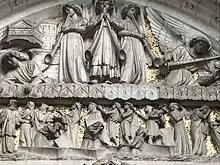The imagery of the tympanum is taken from the Book of Revelation, with the divine on the upper register and mortals below. It shows an angel, accompanied by John the Evangelist, measuring the temple in Jerusalem, while beneath them the dead rise from their graves.[25] Of these sculptures, the Victorian critic Charles Eastlake wrote in A History of the Gothic Revival, "no finer examples of decorative sculpture have been produced during the Revival".[1]