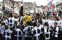 The flag is often displayed on bumper stickers, and flying from buildings, including those of Cornwall Council.[15] It is flown at most Cornish gatherings, such as the Gorsedh Kernow, St Piran's Day (5 March), Camborne's Trevithick Day (April), Padstow's 'Obby 'Oss festival (May), Helston's Flora Day (May), and at Cornish rugby matches. It is regularly seen around Cornwall on car stickers with the word Kernow (Cornish for Cornwall), and is used around the world as a symbol of the Cornish diaspora or overseas Cornish associations. It has been adapted for use in the logos of a number of organisations, such as the Cornwall district of the Methodist Church, is used by a variety of Cornish businesses such as Ginsters, and is seen on the design of the Cornish All Blacks rugby shirts as well as the Cornish Pirates rugby logo.[15]