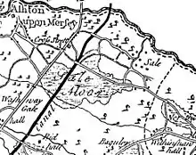 The extension of the Bridgewater Canal to Runcorn was completed as far as Sale by 1765, and transformed the town's economy by providing a quick and cheap route into Manchester for fresh produce.[17] Farmers who took their wares to market in Manchester brought back night soil to fertilise the fields.[18] Not everyone benefited from the canal however; several yeomen claimed that their crops were damaged by flooding from the Barfoot Bridge aqueduct.[19] A 1777 map shows the village of Cross Street, on the site of the road now of the same name, divided between the townships of Sale and Ashton upon Mersey.[20] The village was first referred to in 1586 and is believed to have originated around this time.[21] The map also shows that Sale was spread out, mainly consisting of farmhouses around Dane Road, Fairy Lane, and Old Hall Road.[20] Sale absorbed Cross Street as it expanded.
