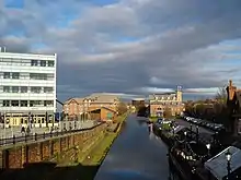 The main shopping centre in Sale, Stanley Square (formerly known as "the Square Shopping Centre"; the name was changed in 2021), was constructed in the 1960s on the site of a former Methodist chapel. Following the Trafford Centre's opening in 1998, it was expected that the centre would suffer, but it has since prospered.[79] In 2003 the Square Shopping Centre underwent a £7 million refurbishment, a major part of the redevelopment of Sale's town centre. It was sold for £40M in 2005, by which time the Square had experienced an increase in trade and demand for tenancy that had led to an increase of 70% in rental income.[80] The town's economy expanded to the extent that in 2007, at a time when the rest of south Manchester was oversupplied with office space, Sale's available office and commercial space was at an all-time low because of high demand.[81]