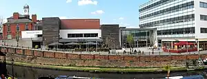 Situated next to the town hall, the Waterside Arts Centre houses a plaza, a library, the Robert Bolt Theatre, the Lauriston Gallery, and the Corridor Gallery. The centre, which was opened in 2004, regularly hosts concerts, exhibitions and other community events. Performers have included comedian Lucy Porter, Midge Ure, Fairport Convention, The Zombies and Sue Perkins.[93] In 2004, the centre received the British Urban Regeneration Association Award for its innovative use of space and for reinvigorating Sale town centre.[94]