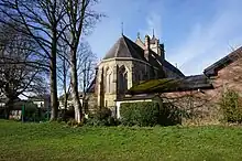 Sale's first school was built in 1667 and was used until the first half of the 18th century.[111] The second school in Sale was built some time in the 18th century, one of about 30 non-grammar schools founded in Cheshire around this time.[111] By 1831, there were two private schools – with the children's parents paying fees for their education – in Sale and one in Ashton upon Mersey.[112] At the same time, there were also four Sunday schools in Sale and one in Ashton upon Mersey, operated by various religious denominations, including Congregationalists, Methodists, and Unitarians. The first school-chapel built in Sale as part of a school was constructed by Primitive Methodists in 1839, and still survives. The second school-chapel in the town was St Joseph's Roman Catholic Church, built in 1866, and was replaced by the current school in 1899.[113]