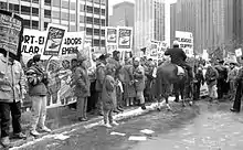 The repression in rural areas resulted in the displacement of large portions of the rural populace, and many peasants fled. Of those who fled or were displaced, some 20,000 resided in makeshift refugee centers on the Honduran border in conditions of poverty, starvation and disease.[111] The army and death squads forced many of them to flee to the United States, but most were denied asylum.[112] A US congressional delegation that, on 17–18 January 1981, visited the refugee camps in El Salvador on a fact finding mission, submitted a report to Congress that found: "[T]he Salvadoran method of 'drying up the ocean' is to eliminate entire villages from the map, to isolate the guerrillas, and deny them any rural base off which they can feed."[113]
