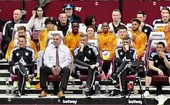 Allardyce's main signing of summer 2013 was Andy Carroll, for a £15 million fee from Liverpool, whilst he also spent an undisclosed fee on winger Stewart Downing, again from Liverpool, to provide crosses for Carroll to convert into goals.[164] He also signed goalkeeper Adrián on a free transfer from Real Betis.[165] However Allardyce's plans were disrupted when Carroll picked up a long-term injury, which left Allardyce regretting the transfer, especially as he had chosen Carroll instead of signing Swansea City's Wilfried Bony, who went on to score 16 league goals in the 2013–14 campaign.[166] Allardyce was awarded the Premier League Manager of the Month for February 2014 following a run of four wins and one draw in their five Premier League games.[167] In April 2014, during an away game against West Bromwich Albion, a section of West Ham fans expressed their distaste at the style of football played under Allardyce by displaying a banner which read "Fat Sam Out, killing WHU".[168] The following month some supporters hung a banner bearing the legend "Fat Sam Out" outside the mansion owned by club chairman, David Sullivan, in Theydon Bois, Essex.[169] Despite protests, on 20 May 2014, the club announced that Allardyce would be staying as manager and would be supported by new attacking coach Teddy Sheringham for the 2014–15 season to "ensure the team provides more entertainment" and to "improve the club's goal tally".[170][171]
