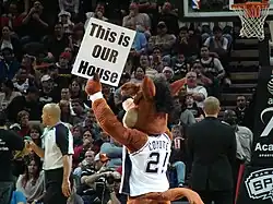 After the deal was signed, the team was renamed the San Antonio Gunslingers.[29] However, before they even played a game, the name was changed to Spurs. The team's primary colors were changed from the red, white, and blue of the Chaparrals to the now-familiar black, silver and white motif of the Spurs, with the branding taking effect for the 1973–74 season.[30] In their first game at HemisFair Arena, the Spurs lost to the San Diego Conquistadors despite attracting a crowd of 6,000 fans. A smothering defense was the team's trademark, as they held opponents to less than 100 points in an ABA-record 49 games. The early Spurs were led by ABA veteran James Silas, and the team grew stronger by acquiring Swen Nater (who would go on to win the Rookie of the Year award) and George Gervin from the Virginia Squires in January. The ABA tried to halt the Gervin deal, claiming it was detrimental to the league; however, a judge ruled in the Spurs' favor and Gervin made his Spurs debut on February 7, 1974. The Spurs finished their inaugural season under that banner with a 45–39 record, good for third place in the Western Division. In the playoffs, the team was defeated by the Indiana Pacers in seven games in the first round. San Antonio embraced the Spurs with open arms; the Spurs drew 6,303 fans per game, surpassing the Chaparrals' entire total attendance in only 18 games. Drossos, Schaefer and McCombs knew a runaway hit when they saw it. After only one year, they exercised their option to tear up the lease agreement, buy the franchise outright and keep the team in San Antonio for good.[31]