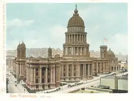 San Francisco City Hall is the seat of government for the City and County of San Francisco, California. Re-opened in 1915 in its open space area in the city's Civic Center, it is a Beaux-Arts monument to the City Beautiful movement that epitomized the high-minded American Renaissance of the 1880s to 1917. The structure's dome is taller than that of the United States Capitol by 42 feet (13 m).[8] The present building replaced an earlier City Hall that was destroyed during the 1906 earthquake, which was two blocks from the present one.