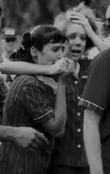 Several survivors later reported observing Huberty walk toward the service counter and adjust a portable radio, possibly to search for news reports of his shooting spree,[28] before selecting a music station and further shooting individuals as he danced to the music.[49] Shortly thereafter, Huberty searched the kitchen area, discovering six employees and shouting: "Oh, there's more. You're trying to hide from me you bastards!"[4] In response, one of the female employees screamed in Spanish, "Don't kill me! Don't kill me!"[4] before Huberty opened fire, killing 21-year-old Paulina López, 19-year-old Elsa Borboa-Fierro,[50] and 18-year-old Margarita Padilla, and critically wounding 17-year-old Albert Leos.[51] Immediately before Huberty had begun shooting, Padilla grabbed the hand of her friend and colleague, 17-year-old Wendy Flanagan, before the two began to run.[52] Padilla was then fatally shot;[52] Flanagan, four other employees and a female customer and her infant hid inside a basement utility room. They were later joined by Leos, who had crawled to the utility room after being shot five times.[53][n 4]