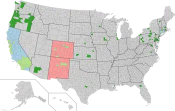 In the United States, municipal policies include prohibiting police or city employees from questioning people about their immigration status and refusing requests by national immigration authorities to detain people beyond their release date, if they were jailed for breaking local law.[1] Such policies can be set expressly in law (de jure) or observed in practice (de facto), but the designation "sanctuary city" does not have a precise legal definition. The Federation for American Immigration Reform estimated in 2018 that 564 U.S. jurisdictions, including states and municipalities, had adopted sanctuary policies.[2][3][4]