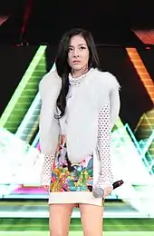 Park features some of the most iconic and memorable styles in the Korean industry, ranging from her signature tail lilt eye make-up, to her bold hair styles and clothing.[100][101] Labeled a pioneer of unconventional trends, her first appearance in Lollipop sporting her 'palm-tree' hairstyle became the most famous and widely parodied style in 2009 and remains an iconic piece in K-pop.[102][103] In particular, her 2012 look, for which she had shaved a portion of her trademark locks for the promotional single "I Love You", attracted massive media attention and initially garnered mixed reactions, but was nonetheless praised for its shock factor and contradictory styling to the typical girl-group 'look'.[104][105] The style is considered to be her most noteworthy transformation.[106]