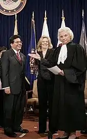 Justice O'Connor presents Alberto Gonzales to the audience after swearing him in as U.S. Attorney General, as Becky Gonzales looks on.
