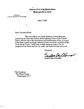 Prior to O'Connor's tenure on the Court, she was a judge and an elected official in Arizona, serving as the first female majority leader of a state senate as the Republican leader in the Arizona Senate.[7] Upon her nomination to the Court, O'Connor was confirmed unanimously by the Senate. On July 1, 2005, she announced her intention to retire, effective upon the confirmation of a successor.[8] Samuel Alito was nominated to take her seat in October 2005 and joined the Court on January 31, 2006.