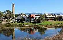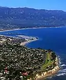Santa Barbara (Spanish: Santa Bárbara, meaning 'Saint Barbara') is a coastal city in Santa Barbara County, California, of which it is also the county seat. Situated on a south-facing section of coastline, the longest such section on the West Coast of the United States excepting Alaska, the city lies between the steeply rising Santa Ynez Mountains and the Pacific Ocean. Santa Barbara's climate is often described as Mediterranean, and the city has been dubbed "The American Riviera".[11] According to the 2020 U.S. Census, the city's population was 88,665.[12]