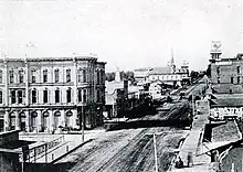 While the Civil War had little effect on Santa Barbara, the disastrous drought of 1863 ended the Rancho Period, as most of the cattle died and ranchos were broken up and sold. Mortimer Cook, a wealthy entrepreneur, arrived in 1871 and opened the city's first bank. Cook later served two terms as mayor.[30] Cook founded the first National Gold Bank of Santa Barbara in 1873. The building of Stearns Wharf in 1872 enhanced Santa Barbara's commercial and tourist accessibility; previously goods and visitors had to transfer from steamboats to smaller craft to row ashore. During the 1870s, writer Charles Nordhoff promoted the town as a health resort and destination for well-to-do travelers from other parts of the U.S.; many of them came, and many stayed. The luxurious Arlington Hotel dated from this period. In 1887 the railroad finally went through to Los Angeles, and in 1901 to San Francisco: Santa Barbara was now easily accessible by land and by sea, and subsequent development was brisk.[31] Santa Barbara had a system of street railways that operated from 1875 through 1929. Begun as a single mule-drawn line from the waterfront pier to the Arlington Hotel, over the decades it was incrementally expanded, later electrified, and operated until its closure in June 1929.