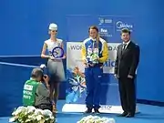 In 2015, and leading up to the World Championships, Sjöström received the Jerring Prize and a Victoria Scholarship.[46] Approximately two months earlier, at the 2015 Eindhoven Swim Cup in April, she became the first female Swedish swimmer to achieve a time faster than 1:00.00 in the 100 metre backstroke, setting a new Swedish record with a personal best time of 59.98 seconds.[47] At the 2015 World Aquatics Championships, held in July and August, she won a total of five medals, including gold medals in the 50 metre butterfly and 100 metre butterfly events, during the latter she broke the world record twice, first with a 55.74 in the semifinals then again with a 55.64 in the final.[48][49] Her gold medal in the 50 metre butterfly was the first gold medal she won at a FINA World Aquatics Championships. With both of the gold medals, she also became the first Swedish swimmer to win two World Championships gold medals during a single World Aquatics Championships. In the 100 metre freestyle, she won the silver medal with a time of 52.70 seconds, sharing the podium with Australian sisters Bronte Campbell, gold medalist, and Cate Campbell, bronze medalist.[50]
