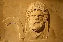 The statue of Saturn at his main temple normally had its feet bound in wool, which was removed for the holiday as an act of liberation.[23][24] The official rituals were carried out according to "Greek rite" (ritus graecus). The sacrifice was officiated by a priest,[25] whose head was uncovered; in Roman rite, priests sacrificed capite velato, with head covered by a special fold of the toga.[26] This procedure is usually explained by Saturn's assimilation with his Greek counterpart Cronus, since the Romans often adopted and reinterpreted Greek myths, iconography, and even religious practices for their own deities, but the uncovering of the priest's head may also be one of the Saturnalian reversals, the opposite of what was normal.[27]