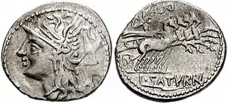 Saturn also had a less benevolent aspect. One of his consorts was Lua, sometimes called Lua Saturni ("Saturn's Lua") and identified with Lua Mater, "Mother Destruction", a goddess in whose honor the weapons of enemies killed in war were burned, perhaps in expiation.[35] Saturn's chthonic nature connected him to the underworld and its ruler Dīs Pater, the Roman equivalent of Greek Plouton (Pluto in Latin) who was also a god of hidden wealth.[36] In sources of the third century AD and later, Saturn is recorded as receiving dead gladiators as offerings (munera) during or near the Saturnalia.[37] These gladiatorial events, ten days in all throughout December, were presented mainly by the quaestors and sponsored with funds from the treasury of Saturn.[38]