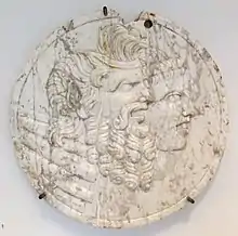 The practice of gladiator munera was criticized by Christian apologists as a form of human sacrifice.[39][40] Although there is no evidence of this practice during the Republic, the offering of gladiators led to later theories that the primeval Saturn had demanded human victims. Macrobius says that Dīs Pater was placated with human heads and Saturn with sacrificial victims consisting of men (virorum victimis).[41][40] In mythic lore, during the visit of Hercules to Italy, the civilizing demigod insisted that the practice be halted and the ritual reinterpreted. Instead of heads to Dīs Pater, the Romans were to offer effigies or masks (oscilla); a mask appears in the representation of Saturnalia in the Calendar of Filocalus. Since the Greek word phota meant both 'man' and 'lights', candles were a substitute offering to Saturn for the light of life.[33][34] The figurines that were exchanged as gifts (sigillaria) may also have represented token substitutes.[42]