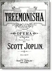 In 1907, Joplin moved to New York City, which he believed was the best place to find a producer for a new opera. After his move to New York, Joplin met Lottie Stokes, whom he married in 1909.[43] In 1911, unable to find a publisher, Joplin undertook the financial burden of publishing Treemonisha himself in piano-vocal format. In 1915, as a last-ditch effort to see it performed, he invited a small audience to hear it at a rehearsal hall in Harlem. Poorly staged and with only Joplin on piano accompaniment, it was "a miserable failure" to a public not ready for "crude" black musical forms—so different from the European grand opera of that time.[48] The audience, including potential backers, was indifferent and walked out.[49] Scott writes that "after a disastrous single performance...Joplin suffered a breakdown. He was bankrupt, discouraged, and worn out." He concludes that few American artists of his generation faced such obstacles: "Treemonisha went unnoticed and unreviewed, largely because Joplin had abandoned commercial music in favor of art music, a field closed to African Americans."[34] In fact, it would not be until the 1970s that the opera received a full theatrical staging.