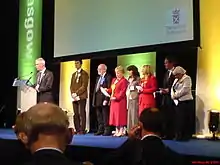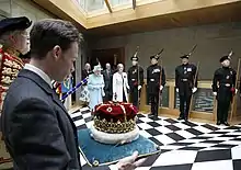 In front of the Presiding Officers' desk is the parliamentary mace,[43] which is made from silver and inlaid with gold panned from Scottish rivers and inscribed with the words: Wisdom, Compassion, Justice and Integrity.[44] The words There shall be a Scottish Parliament, which are the first words of the Scotland Act, are inscribed around the head of the mace,[43][44][45] which has a ceremonial role in the meetings of Parliament,[46] representing the authority of the Parliament to make laws.[44] Presented to the Scottish Parliament by the Queen upon Parliament's official opening in July 1999, the mace is displayed in a glass case, suspended from the lid. At the beginning of each sitting in the chamber, the lid of the case is rotated so that the mace is above the glass, to symbolise that a full meeting of the Parliament is taking place.[37]