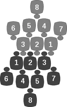 The two second row forwards (jersey numbers four and five) bind together and directly behind the front row with each putting their heads between the props and the hooker. They are more commonly referred to as locks as they "lock" the scrum. Lastly the back row is made up of the two flankers and the number eight. The flankers bind on each side of the scrum — next to a lock and behind a prop.[1] Generally the number seven flanker is referred to as the openside flanker, and with the number six flanker as the blindside flanker.[3] "Openside" and "blindside" refer to the wide and narrow side of the pitch respectively, as scrums usually occur closer to one of the touchlines than the other. The openside flanker's job is to get to the next ruck or maul as quickly as possible, so they will usually bind on that side. The number 8 binds behind the two locks, with his/her head between them.