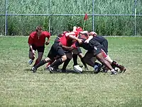 To prepare for a scrum, each team's eight forwards (referred to as the pack or forward pack) bind together in three rows — the front row, second row and back row. The front row is composed of the two props and the hooker. To the left is the loosehead prop with the hooker in the middle, and the tighthead prop on the right (jersey numbers one, two and three). The "tighthead" prop, number three, earns that name as his head and shoulders sits between the hooker and the loosehead prop of the opposing side, meaning he sits in a "tighter" scrum position. The loosehead prop, by contrast, has one shoulder open to the outside of the scrum, and so is in a "looser" scrum position. The three bind together tightly and there is no gap between the hooker and either prop.[1] According to the laws of the game; "When a player binds on a team-mate that player must use the whole arm from hand to shoulder to grasp the team-mate’s body at or below the level of the armpit."[2] Failing to bind properly results in a penalty, and the opposition team being awarded a free kick.