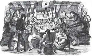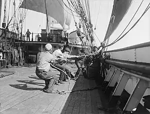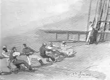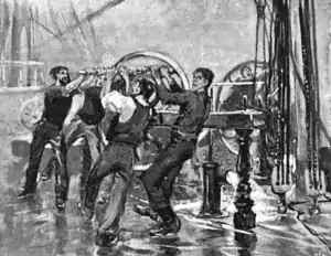 An example of a work song that was shared between several contexts, including, eventually, sailors working, is "Grog Time o' Day". This song, the tune of which is now lost, was sung by: Jamaican stevedores at a capstan in 1811;[47] Afro-Caribbeans rowing a boat in Antigua ca.1814;[48] Black stevedores loading a steamboat in New Orleans in 1841;[49] and a European-American crew hauling halyards on a clipper-brig out of New York ca.1840s.[50] Other such multi-job songs were: "Round the Corn(er), Sally", "Fire Down Below", "Johnny Come Down to Hilo", "Hilo, Boys, Hilo", "Tommy's Gone Away", "The Sailor Likes His Bottle-O", "Highland Laddie", "Mudder Dinah", "Bully in the Alley", "Hogeye Man", "Good Morning, Ladies, All", "Pay Me the Money Down", "Alabama, John Cherokee", "Yankee John, Stormalong", and "Heave Away (My Johnnies)".[40]
