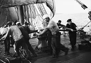 One of the earliest references to shanty-like songs that has been discovered was made by an anonymous "steerage passenger" in a log of a voyage of an East India Company ship, entitled The Quid (1832). Crew and passengers alike were noted to join in at heaving the capstan around. They were said to sing "old ditties", along with which a few verses to one or more songs is given.[38] While this practice was analogous to the practice of what is later called singing "capstan shanties", the form of these verses is not particularly similar to later shanties. These songs do not appear to correspond to any shanty known from later eras. It is possible that the long, monotonous task of heaving the capstan had long inspired the singing of time-passing songs of various sorts, such as those in The Quid. For example, the composition of capstan-style "sailor songs" by Norwegian poet Henrik Wergeland as early as 1838[39] implies that Scandinavians also used such songs. However, these older songs can be distinguished from the later type of songs that were given the label shanty, suggesting there were other formative influences that gave birth to an appreciably new and distinctly recognized phenomenon.[40]