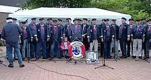 An on-shore revival in shanty singing for leisure was facilitated by song collections of the 1920s, especially Terry's The Shanty Book (in two volumes, 1921 and 1926).[16] What set apart this and following collections was full musical score along with an adequate stock of lyrics. Collections prior to Terry's (except for Davis and Tozer's much earlier and contrived-sounding settings) had not provided enough verses to create "full" songs, and it is unlikely that performers would venture to improvise new verses in the manner of traditional shantymen. By 1926, it had become a custom at the Seven Seas Club in London to hold a shanty sing-along after the club's monthly dinners.[115] By 1928, commercial recordings of shanties, performed in the manner of classical concert singing, had been released on HMV, Vocalion, Parlophone, Edison, Aco, and Columbia labels;[116] many were realizations of scores from Terry's collection. Shanties like "Johnny Come Down to Hilo" were more or less standardized through popular dissemination.
