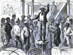 In the first few decades of the 19th century, European-American culture, especially the Anglophone—the sailors' "Cheer'ly Man" and some capstan songs notwithstanding—was not known for its work songs. By contrast, African workers, both in Africa and in the New World, were widely noted to sing while working. According to Gibb Schreffler, an Associate Professor of Music at Pomona College, European observers found African work-singers remarkable (as Schreffler infers from tone of their descriptions). Schreffler further infers that work songs may have had far less currency among European culture, based on the scant evidence of work-singing aboard European ships in the century prior.[43] Such references begin to appear in the late 18th century, whence one can see the cliché develop that Black Africans "could not" work without singing. For example, an observer in Martinique in 1806 wrote, "The negroes have a different air and words for every kind of labour; sometimes they sing, and their motions, even while cultivating the ground, keep time to the music."[44] So while the depth of the African-American work song traditions is now recognized,[45] in the early 19th century they stood in stark contrast to the paucity of such traditions among European-Americans. Thus while European sailors had learned to put short chants to use for certain kinds of labor, the paradigm of a comprehensive system of developed work songs for most tasks may have been contributed by the direct involvement of or through the imitation of African-Americans.[43] The work contexts in which African-Americans sang songs comparable to shanties included: