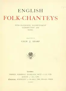 Somewhere between these perspectives was Cecil Sharp's, whose English Folk-Chanteys (1914) was published in the same year, and was based on shanties he collected from aged English sailors in Britain.[90] Sharp responds to Bullen's claims of African-American origins by ceding that many shanties were influenced through the singing of Black shantymen[91]—a position that assumes English folk song was the core of the tradition by default. The title of Sharp's work reflects his project of collecting and grouping shanties as part of what he conceived to be a rather continuous English folk song tradition. Sharp states in the introduction that he deliberately excluded shanties which were obviously (i.e. to him) born of popular songs.[92] This idea is problematic when one considers that the popular songs that were feeding shanties were largely American and based in real or imagined African-American musical traits. However, Sharp believed that by eliminating such shanties based on popular songs, he could concentrate those that were "folk" songs. Of his own admission, Sharp lacked any shantying or sea experience to intuitively judge shanties like someone such as Bullen, however he offers his objectivity, recording precisely what was sung to him, as consolation.[92] While Sharp's manner of documenting shanties was more or less objective, the field of his research and his biases in what to collect certainly influenced the outcome of this study.[93] And whereas Bullen's work was fairly inaccessible, Sharp was influential as the leader of a cohort of scholars who were actively creating the young field of folk song research.