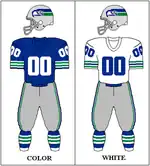 When the Seahawks debuted in 1976, the team's logo was a stylized royal blue and forest green osprey's head based on Kwakwakaʼwakw art masks.[57] The helmet and pants were silver while the home jerseys were royal blue with white and green sleeve stripes and white numerals and names. The road jersey was white, with white, blue and green sleeve stripes and had blue numerals and names. The socks were blue and had the same green and white striping pattern seen on the blue jerseys. Black shoes were worn for the first four seasons, one of the few NFL teams that did so in the late 1970s, at a time when most teams were wearing white shoes. They would switch to white shoes in 1980.[58]