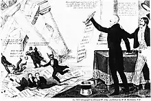 Biddle made repeated overtures to Jackson and his cabinet to secure a compromise on the bank's rechartering (its term due to expire in 1836) without success.[65][66] Jackson and the anti-bank forces persisted in their condemnation of the bank,[60][67] provoking an early recharter campaign by pro-bank National Republicans under Henry Clay.[68][69] Clay's political ultimatum to Jackson[70]—with Biddle's financial and political support[71][72]—sparked the Bank War[73][74] and placed the fate of the bank at center of the 1832 presidential election.[75]