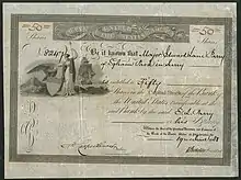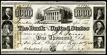 The Second Bank of the United States was the second federally authorized Hamiltonian national bank in the United States. Located in Philadelphia, Pennsylvania, the bank was chartered from February 1816 to January 1836.[1] The bank's formal name, according to section 9 of its charter as passed by Congress, was "The President, Directors, and Company, of the Bank of the United States".[2] While other banks in the US were chartered by and only allowed to have branches in a single state, it was authorized to have branches in multiple states and lend money to the US government.