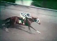 Secretariat raced in Meadow Stables' blue-and-white-checkered colors. He never raced in track bandages, but typically wore a blinker hood, mostly to help him focus, but also because he had a tendency to run in toward the rail during races.[23] In January 1972, he joined trainer Lucien Laurin's winter stable at Hialeah. Secretariat gained a reputation as a kind horse, likeable and unruffled in crowds or by the bumping that occurs between young horses. He had the physique of a runner but at first was awkward and clumsy. He was frequently outpaced by more precocious stable mates, running a quarter-mile in 26 seconds compared to 23 seconds by his peers.[33] His regular exercise riders were Jim Gaffney and Charlie Davis. Davis was not initially impressed. "He was a big fat sucker", Davis said. "I mean, he was big. He wasn't in a hurry to do nothin'. He took his time. The quality was there, but he didn't show it until he wanted to."[34] Gaffney though recalled his first ride on Secretariat in early 1972 as "having this big red machine under me, and from that very first day I knew he had a power of strength that I have never felt before ..."[35]