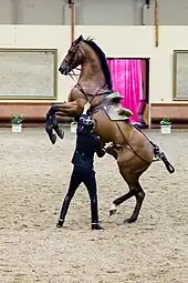 The Institut français du cheval et de l'équitation (French Institute of Horse Riding), the École nationale d'équitation (National Riding School) and the Cadre Noir all use mainly Selle Français. Young horses are selected according to their skills and are trained by students within the schools. Horses representing the Cadre Noir are selected at the age of three and are trained according to their abilities, with some reaching the highest levels of haute ecole dressage.[26] Selle Français are also used for combined driving, equestrian vaulting and competitive trail riding,[19] and have competed at the international level in all three sports.[4]