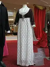 According to Austen scholar Linda Troost, the costumes used in Sense and Sensibility helped emphasise the class and status of the various characters, particularly among the Dashwoods.[49] They were created by Jenny Beavan and John Bright, a team of designers best known for Merchant Ivory films who began working together in 1984.[50][51] The two attempted to create accurate period dress,[49] and featured the "fuller, classical look and colours of the late 18th century."[52] They found inspiration in the works of the English artists Thomas Rowlandson, John Hopper, and George Romney, and also reviewed fashion plates stored in the Victoria and Albert Museum.[53] The main costumes and hats were manufactured at Cosprop, a London-based costumer company.[53]