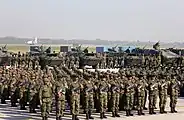The Serbian Revolution for independence from the Ottoman Empire lasted eleven years, from 1804 until 1815.[60][61][62][63] The revolution comprised two separate uprisings which gained autonomy from the Ottoman Empire (1830) that eventually evolved towards full independence (1878). During the First Serbian Uprising (1804–1813), led by vožd Karađorđe Petrović, Serbia was independent for almost a decade before the Ottoman army was able to reoccupy the country.[64] Shortly after this, the Second Serbian Uprising began in 1815. Led by Miloš Obrenović, it ended with a compromise between Serbian revolutionaries and Ottoman authorities.[65] Likewise, Serbia was one of the first nations in the Balkans to abolish feudalism.[66] The Akkerman Convention in 1826, the Treaty of Adrianople in 1829 and finally, the Hatt-i Sharif, recognised the suzerainty of Serbia. The First Serbian Constitution was adopted on 15 February 1835 (the anniversary of the outbreak of the First Serbian Uprising), making the country one of the first to adopt a democratic constitution in Europe.[67][68] 15 February is now commemorated as Statehood Day, a public holiday.[69]