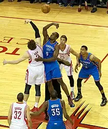 After the lockout, Ibaka returned to the NBA from Spain. On 19 February 2012, he recorded his first career triple-double against the Denver Nuggets, scoring 14 points, grabbing 15 rebounds and getting a career-high 11 blocks.[17] He played all 66 games in the shortened season as a starter, averaging the most blocks in the league, 3.6 per game. In voting for the Defensive Player of the Year, he finished second behind Tyson Chandler of the New York Knicks.[18] In Game 4 of the Western Conference Finals against the San Antonio Spurs, Ibaka went 11–11 from the field. Oklahoma City went on to win the series in six games and advance to the 2012 NBA Finals. In the Finals Ibaka averaged 7 points and 5 rebounds, but the Thunder fell to the Miami Heat in five games.