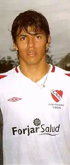 Sergio Agüero joined the youth system of Independiente at the age of nine. He started playing for the side, becoming the youngest player to debut in the first division at 15 years and 35 days (on 5 July 2003 against Club Atlético San Lorenzo de Almagro), when Independiente's coach, Oscar Ruggeri sent Agüero onto the field as a substitute for Emanuel Rivas in the 69th minute of the match.[18][19] His performance was well received by the press.[20][21][22] Despite his early debut, he was not selected again by Ruggeri, and his replacement Osvaldo Sosa, for the remainder of 2002–03 season, having made only one appearance in the Torneo Clausura. Following the arrival of coach Jose Omar Pastoriza, seven months after Agüero's first match he returned to the club's first-team in 4–2 win against Peru's Cienciano during the group stages of the 2004 Copa Libertadores. This meant that he also became the youngest player to participate in the Copa Libertadores, a record that he held for three years.[23] One month later, Agüero again featured in a Copa Libertadores fixture against Ecuador's El Nacional. On 19 June, for the first time, Agüero played a full 90-minute match for Independiente against Atlético de Rafaela during the Torneo Clausura.[24] He scored his first goal for Independiente in a 2–2 draw against Estudiantes on 26 November, with a 22nd minute shot from outside the penalty area.[25][26] Agüero became a regular in the club's first-team, being selected for the Argentina U-20 squad for the 2005 FIFA U-20 World Cup, which Argentina won.