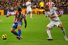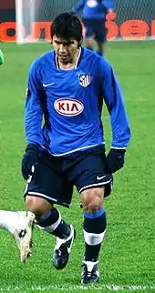 Agüero was once again a regular goalscorer for Atlético in the 2008–09 season, continuing to establish a lethal partnership with Uruguayan striker Diego Forlán, also a former Independiente player. On 16 September, he scored his first Champions League goals in a 3–0 away win at PSV Eindhoven, helping Atlético eventually reach the last 16 of the competition.[42] In March 2009, Forlán and Agüero each scored a brace in a 4–3 win over league leaders Barcelona, the latter scoring the winning goal in the match's final minutes.[43] With the help of more vital goals in a formidable end of the season run-in from his team, Agüero finished in the top ten contenders for the Pichichi Trophy, which was won by his teammate Forlán.[44] Atlético finished fourth in the league, qualifying for the following season's Champions League.