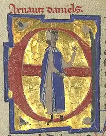 The oldest-known sestina is "Lo ferm voler qu'el cor m'intra", written around 1200 by Arnaut Daniel, a troubadour of Aquitanian origin; he refers to it as "cledisat", meaning, more or less, "interlock".[1] Hence, Daniel is generally considered the form's inventor,[2] though it has been suggested that he may only have innovated an already existing form.[3] Nevertheless, two other original troubadouric sestinas are recognised,[4] the best known being "Eras, pus vey mon benastruc" by Guilhem Peire Cazals de Caortz; there are also two contrafacta built on the same end-words, the best known being Ben gran avoleza intra by Bertran de Born. These early sestinas were written in Old Occitan; the form started spilling into Italian with Dante in the 13th century; by the 15th, it was used in Portuguese by Luís de Camões.[5][6]