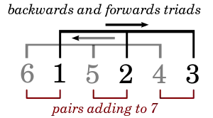 Another way of visualising the pattern of line-ending words for each stanza is by the procedure known as retrogradatio cruciata, which may be rendered as "backward crossing".[36] The second stanza can be seen to have been formed from three sets of pairs (6–1, 5–2, 4–3), or two triads (1–2–3, 4–5–6). The 1–2–3 triad appears in its original order, but the 4–5–6 triad is reversed and superimposed upon it.[37]