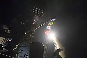 On the evening of 6 April, President Trump notified members of the U.S. Congress of his plan on the missile strike. According to a White House official, more than two dozen members of Congress were briefed at the notification.[14] Internationally, the United States also notified several countries, including Canada, the UK, Australia, and Russia, in advance of the strike.[15][16][17][18] The U.S. military stated it communicated with the Russian military to minimize any chance of Russian casualties.[19] The strike was conducted without either U.S. congressional or United Nations Security Council approval.[20][21][22][23][24][25] Commodore Tate Westbrook commanded the Navy task force in charge of the missile launch.[26]