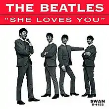 "She Loves You" is a song written by John Lennon and Paul McCartney and recorded by English rock band the Beatles for release as a single in 1963. The single set and surpassed several sales records in the United Kingdom charts, and set a record in the United States as one of the five Beatles songs that held the top five positions in the charts simultaneously, on 4 April 1964. It remains the band's best-selling single in the United Kingdom and was the top-selling single of the 1960s there by any artist.[3]