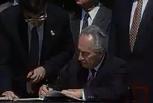 Peres first succeeded Yitzhak Rabin as acting prime minister briefly during 1977, before becoming prime minister from 1984 to 1986. As foreign minister under Prime Minister Rabin, Peres engineered the 1994 Israel–Jordan peace treaty,[12] and won the 1994 Nobel Peace Prize together with Rabin and Yasser Arafat for the Oslo Accords peace talks with the Palestinian leadership.[7] In 1996, he founded the Peres Center for Peace, which has the aim of "promot[ing] lasting peace and advancement in the Middle East by fostering tolerance, economic and technological development, cooperation and well-being."[13] After suffering a stroke, Peres died in 2016 near Tel Aviv.[14][15]