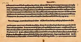 The Shvetashvatara Upanishad is a 1st-millennium BCE Hindu text. Above: verse 1.1 in the center of the manuscript, surrounded by a bhasya (Sanskrit, Devanagari script).