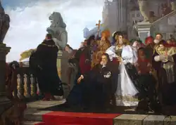 In accordance with the new Treaty of Kraków, the Order was abruptly secularized and turned de facto into a puppet state of Poland which lasted until the Treaty of Bromberg in 1655. Sigismund's nephew Albert, Duke of Prussia, converted to Lutheranism under the persuasion of Martin Luther, and paid a feudal homage to Sigismund.[19] In return he was granted the domains of the Order as the First Duke of Prussia. This became known in Polish and Lithuanian history as the "Prussian Homage", which was often featured in arts. The Prussian Landtag and parliament assembled in Königsberg, where envoys embraced both the new Duke and the Protestant Reformation. Thereupon, the Teutonic Order lost its importance as a military order in Prussia and retreated to the Holy Roman Empire where it became secluded.[18]