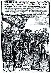 Sigismund suffered from numerous illnesses and diseases, especially towards the end of his life. Most notably, he was tormented by constant fevers since youth as well as gout and acute rheumatism in the autumn of 1528.[26][27] The condition, which severely affected his joints and right leg, was repetitive and continued in 1529 and 1534. It is likely that Sigismund Augustus was co-crowned vivente rege in 1529 as a result of these pervasive pains and in case his father died unexpectedly.[28] Furthermore, bad eating habits and a poor diet contributed to the king's ailing health, in particular large amounts of beer and mead.[26] Eventually, the king's inability to walk forced him to be carried in a litter. However, despite his age, Sigismund was of sound mind throughout and remained active in politics until death.[27] In 1543, he recovered from an influenza which spread in Kraków and in 1545 he enjoyed a last hunting excursion to Niepołomice.[28]